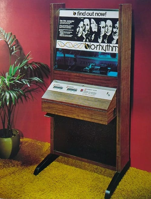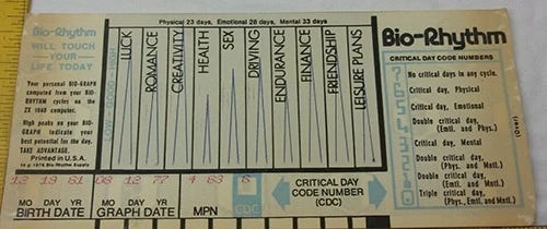 This machine promised to tell you your “biorhythms” — how you would feel physically, emotionally, and mentally for any future date. You just plopped in twenty-five cents, entered your birthdate, and in a matter of seconds, the computer would spit out a scientific-looking card that would tell you your prospects for health, creativity, and romance on the date you requested your biorhythm for. It also told you if you had any "critical days" — days when you would struggle — near the date of your requested biorhythm reading.