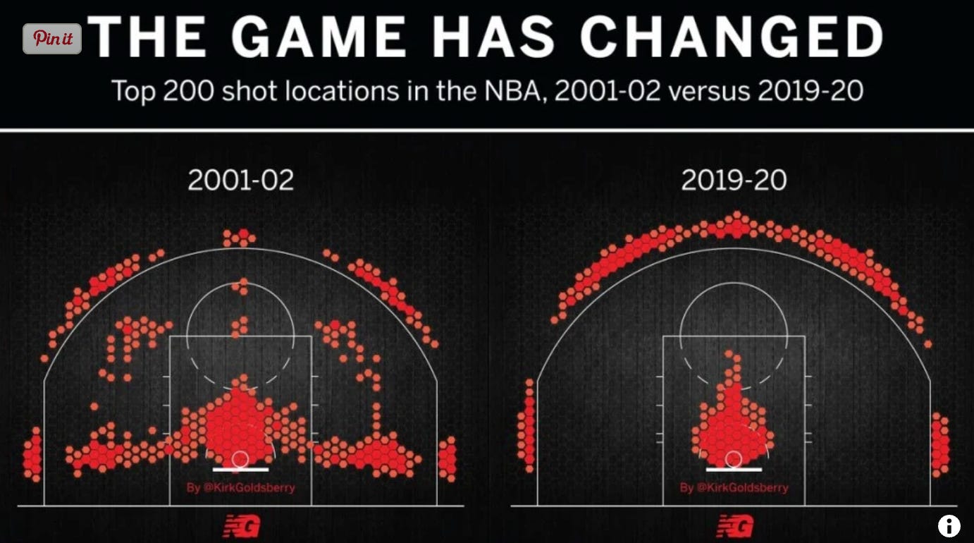 This heatmap showcases how shooting changed in the NBA with the rise of statistics-driven play: